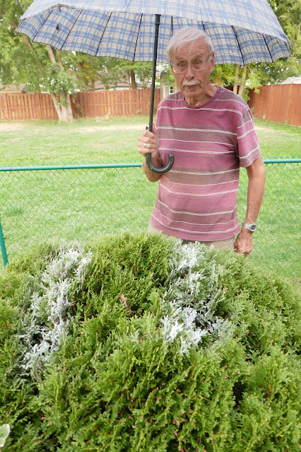 Oops, for lack of space on the workbench, Benno placed the insert panels on the shrub outside the garage and then sprayed 3M Super 77 Spray Adhesive onto the back of the panels, it looks like the frosting on a cake or snow, I was a little ticked off.